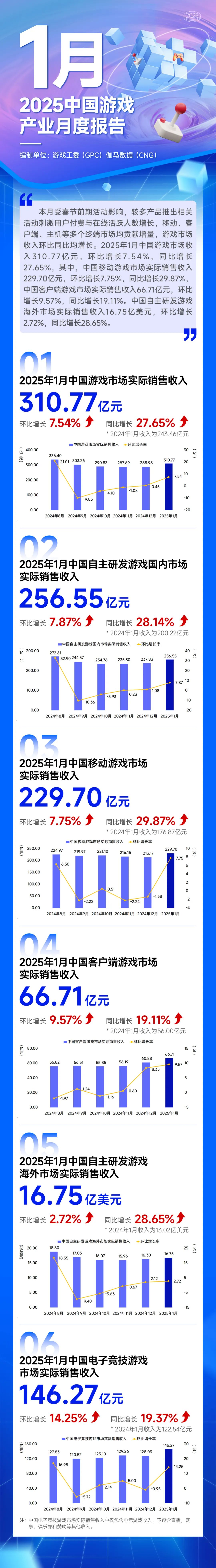 IT之家 2 月 21 日消息,中国音数协游戏工委今日发布 2025 年 1 月中国游戏产业月度报告。本月受春节前期活动影响,较多产品推出相关活动刺激用户付费与在线活跃人数增长,移动、客户端、主机等多个终端市场均贡献增量,游戏市场收入环比同比均增长。