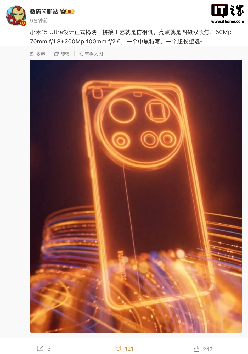 IT之家同时注意到,小米集团总裁卢伟冰将于今天 20 时开启一次“爆料直播”,并邀请“影视飓风”的 Tim 一同展现小米 15 Ultra 的实力,还将首次揭秘小米影像实验室。