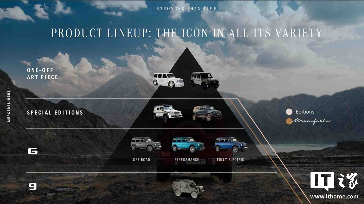 IT之家 2 月 23 日消息,奔驰官方发布了一张奔驰 G 级的族谱图,以金字塔形式清晰展示了该系列的各产品定位。IT之家注意到,族谱塔底出现了一款“小号 G 级”的全新车型,并有望直接以 g 级命名。据悉该车将基于 MMA 架构生产,而同架构下的首款车型 —— 全新奔驰 CLA 也将在 3 月正式发布。