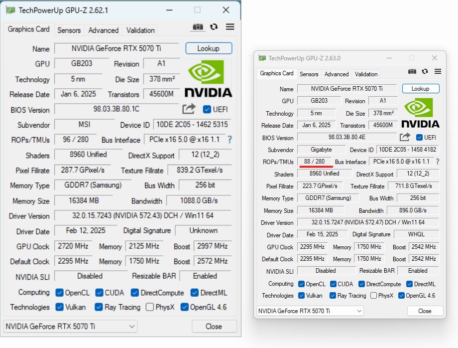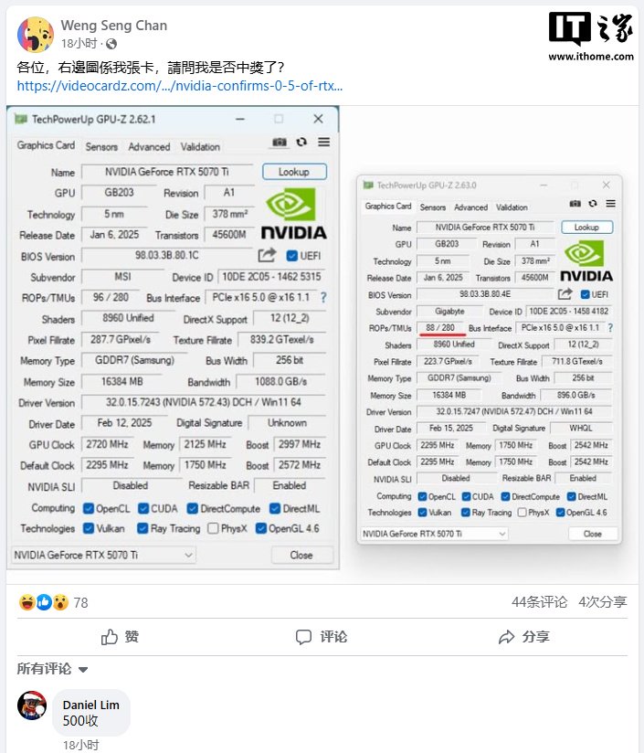 Facebook 用户 Weng Seng Chan 昨日发现,他刚买到的 RTX 5070 Ti 显卡 ROP 数量显示为 88 个(正常规格 96 个),这也是首个发现缺失 ROP 单元的 RTX 5070 Ti 显卡。