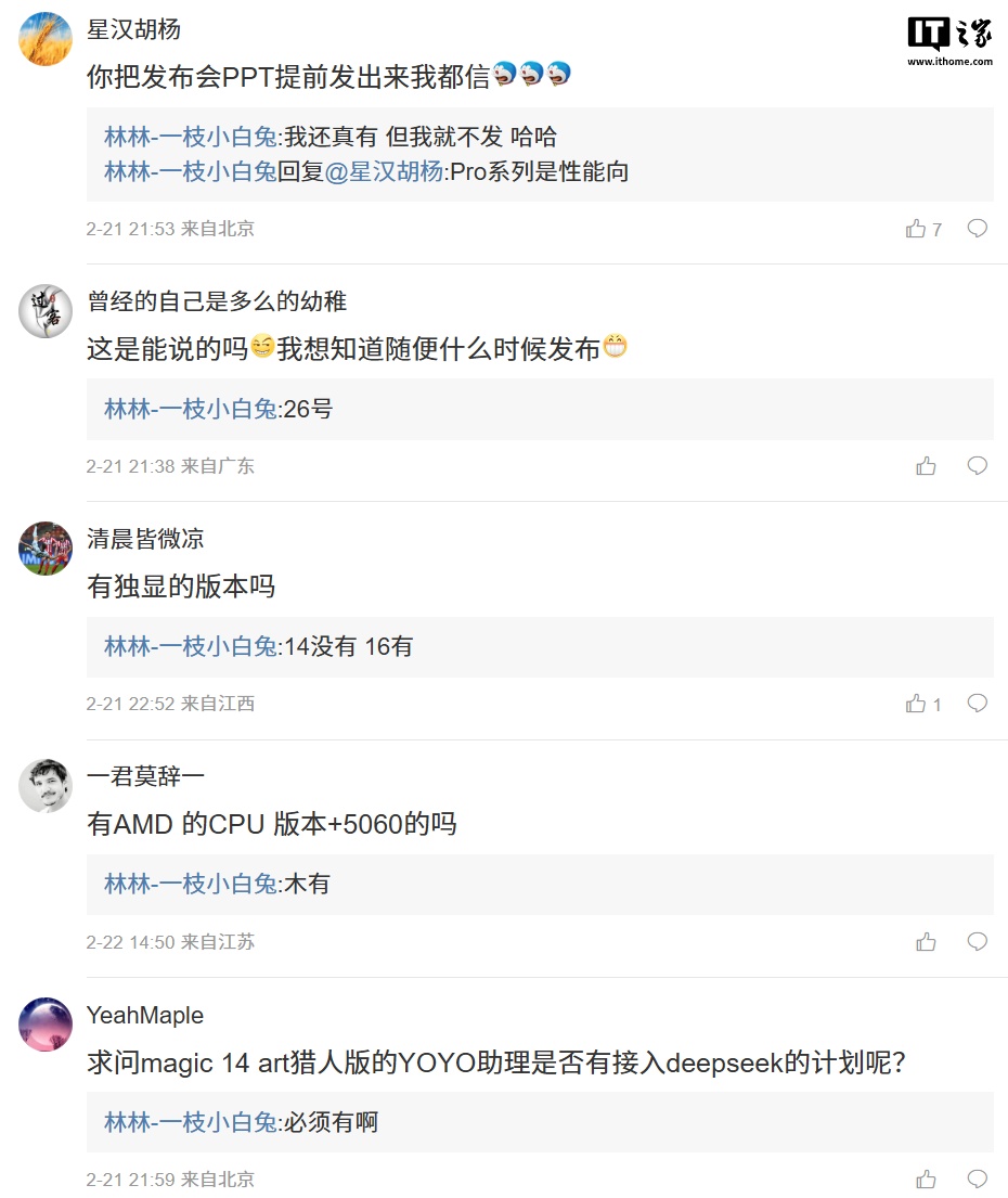 另外,林林还在评论区回复了部分用户的问题:针对是否顶配才能玩《黑神话:悟空》,他称“低画质都行”;针对独显版本产品情况,他表示“14 没有,16 有”;针对 Magic 14 Art 猎人版(此处预计指 MagicBook Pro 或 MagicBook Art 笔记本)是否有接入 DeepSeek 的计划,他回复“必须有啊”。