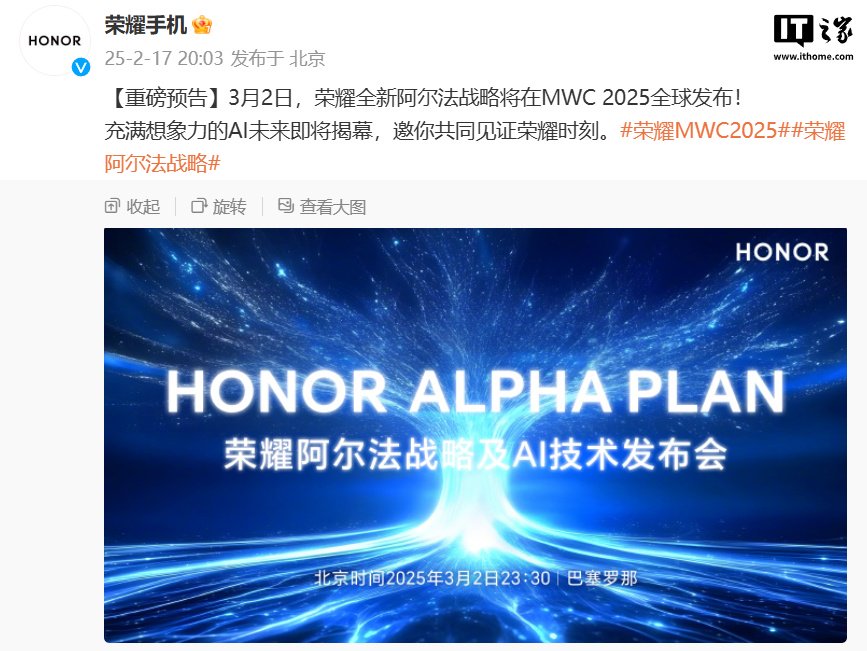 据此前报道,荣耀全新阿尔法战略(HONOR ALPHA PLAN)将于 3 月 2 日 23:30 在 MWC 2025 全球发布,同时荣耀当天还会举行 AI 技术发布会,有消息称其 CEO 李健或将出席此次发布会,完成履新后的首次公开亮相。