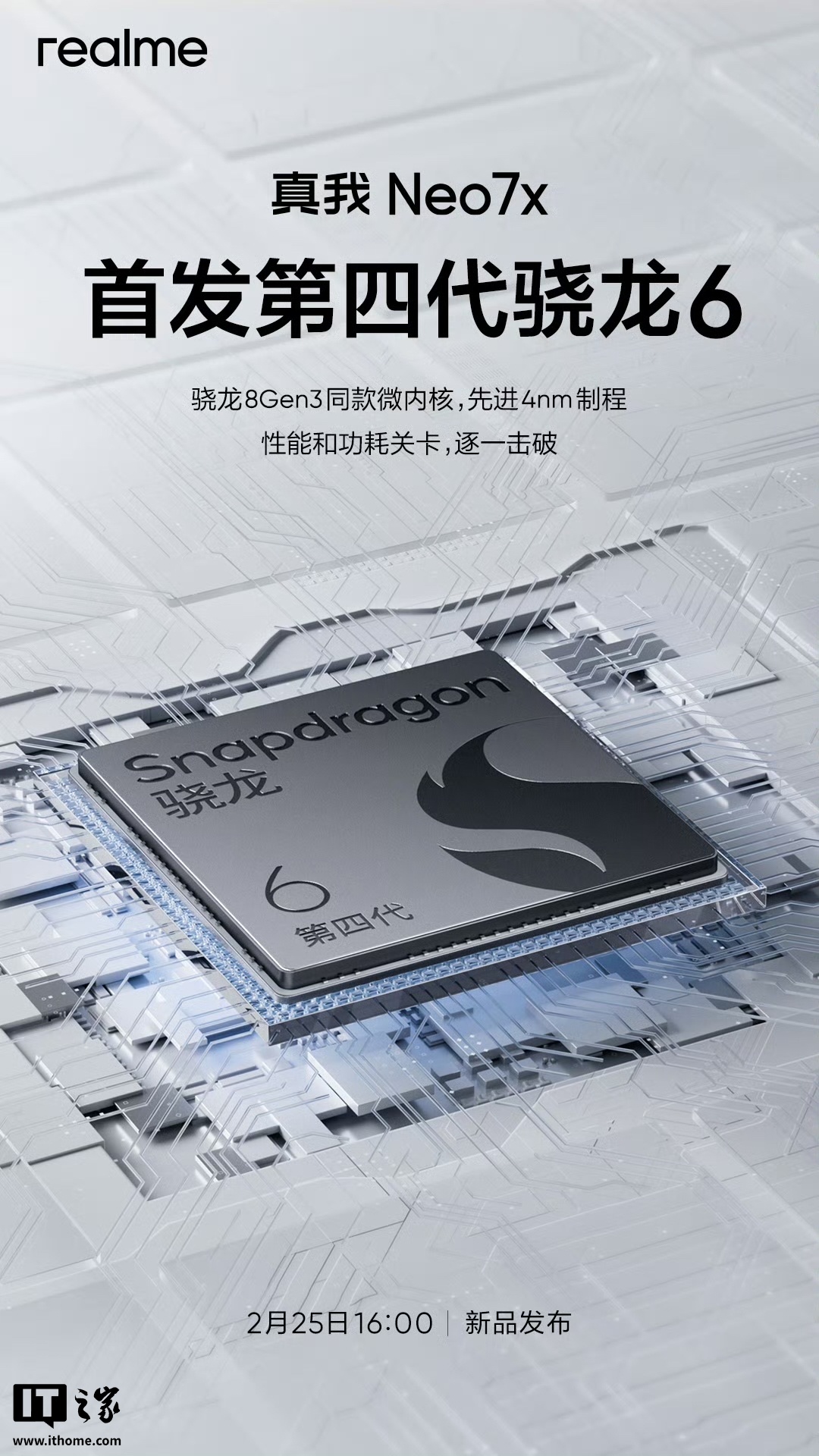 IT之家 2 月 24 日消息,真我官方今日宣布,真我 Neo7x 将全球首发第四代骁龙 6 处理器,该处理器采用骁龙 8 Gen 3 同款微内核架构,先进 4nm 制程加持。
