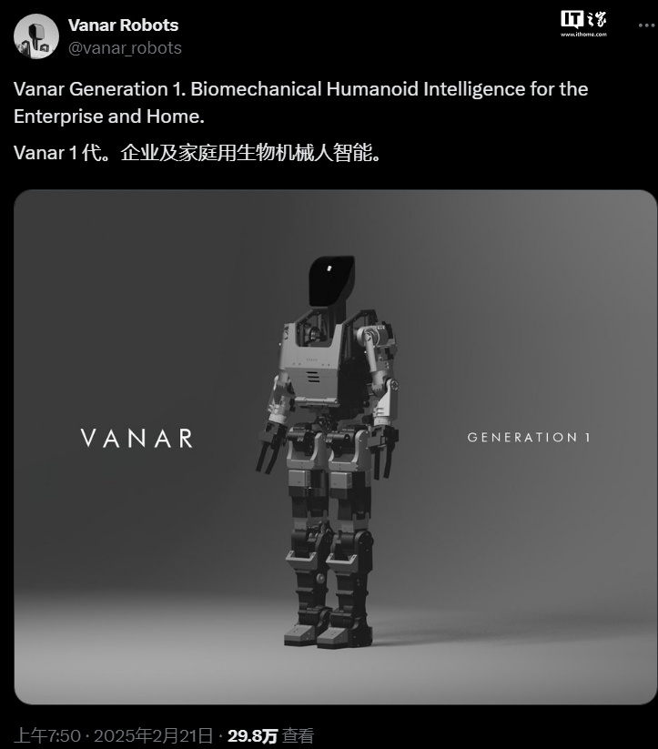 IT之家 2 月 24 日消息,Vanar Robotics 是一家位于印度的人形机器人研究实验室。该实验室于 2 月 21 日正式发布了其第一代人形机器人原型 —— Vanar Generation 1。