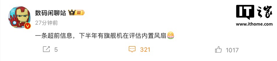 IT之家 2 月 24 日消息,博主 @数码闲聊站 发文,声称今年下半年有一款“TOP5 母系旗舰机”在评估内置风扇,不过该博主并没有暗示具体是哪一家厂商。