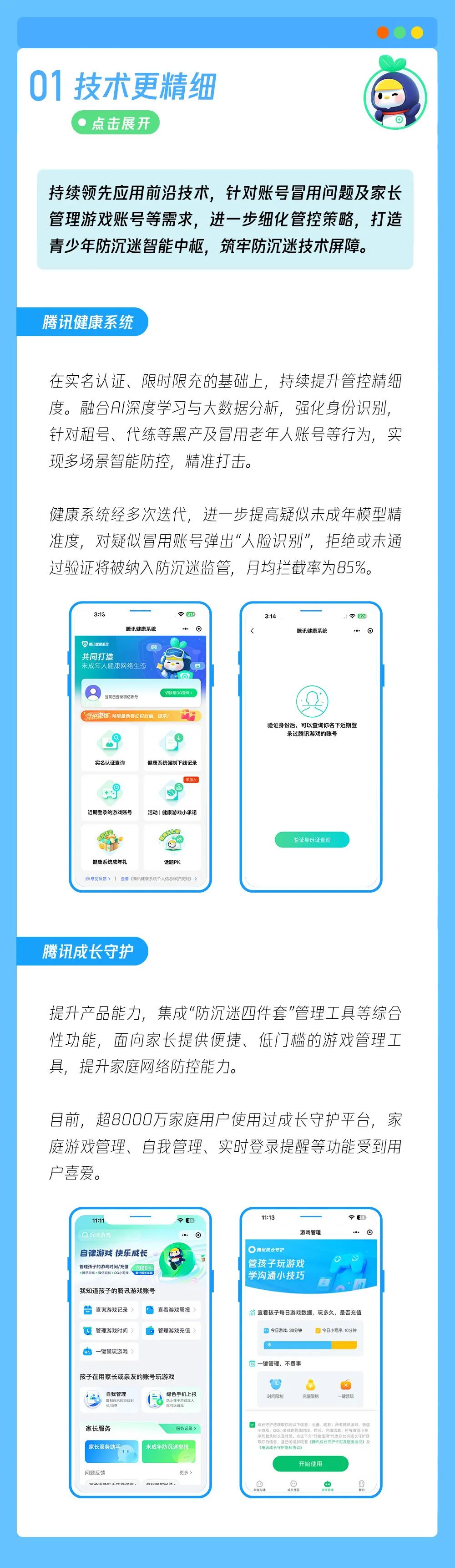 腾讯健康系统在实名认证、限时限充的基础上,融合 AI 深度学习与大数据分析,强化身份识别,针对租号、代练等黑产及冒用老年人账号等行为,实现多场景智能防控。健康系统经多次迭代,进一步提高疑似未成年模型精准度,对疑似冒用账号弹出“人脸识别”,拒绝或未通过验证将被纳入防沉迷监管,月均拦截率为 85%。