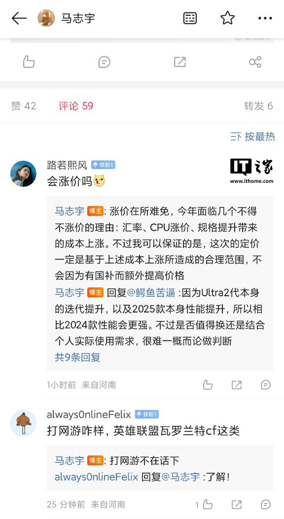 马志宇还表示新机的性能“打网游不在话下”,14 英寸版也有酷睿 Ultra 7 版本。