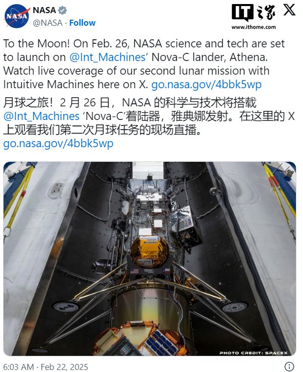 IT之家注意到,该公司再次派遣其 Nova-C 着陆器之一,这次被称为“Athena(雅典娜)”,都是古希腊神话人物。预计雅典娜需要大约一周时间才能到达月球,然后在 3 月 6 日左右尝试着陆。