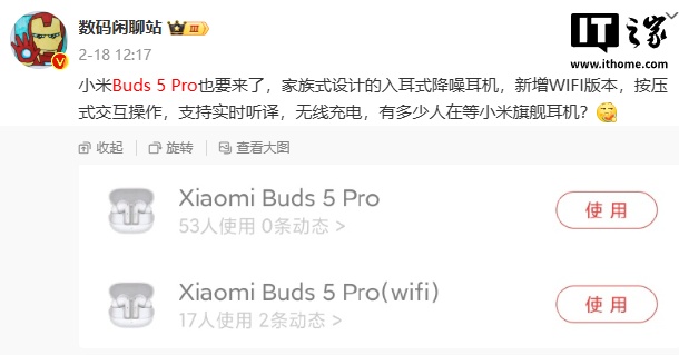据博主 @数码闲聊站 此前透露,小米 Buds 5 Pro 是一款采用家族式设计的入耳式降噪耳机,新增 WIFI 版本,按压式交互操作,支持实时听译,无线充电。