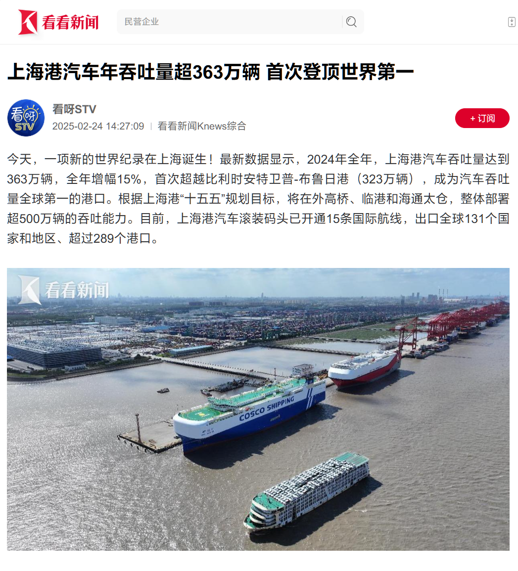 IT之家 2 月 24 日消息,IT之家从“看看新闻”获悉,一项新的世界纪录今日在上海诞生。最新数据显示,上海港 2024 年全年汽车吞吐量达到 363 万辆,全年增幅 15%,首次超越比利时安特卫普-布鲁日港(323 万辆),成为汽车吞吐量全球第一的港口。