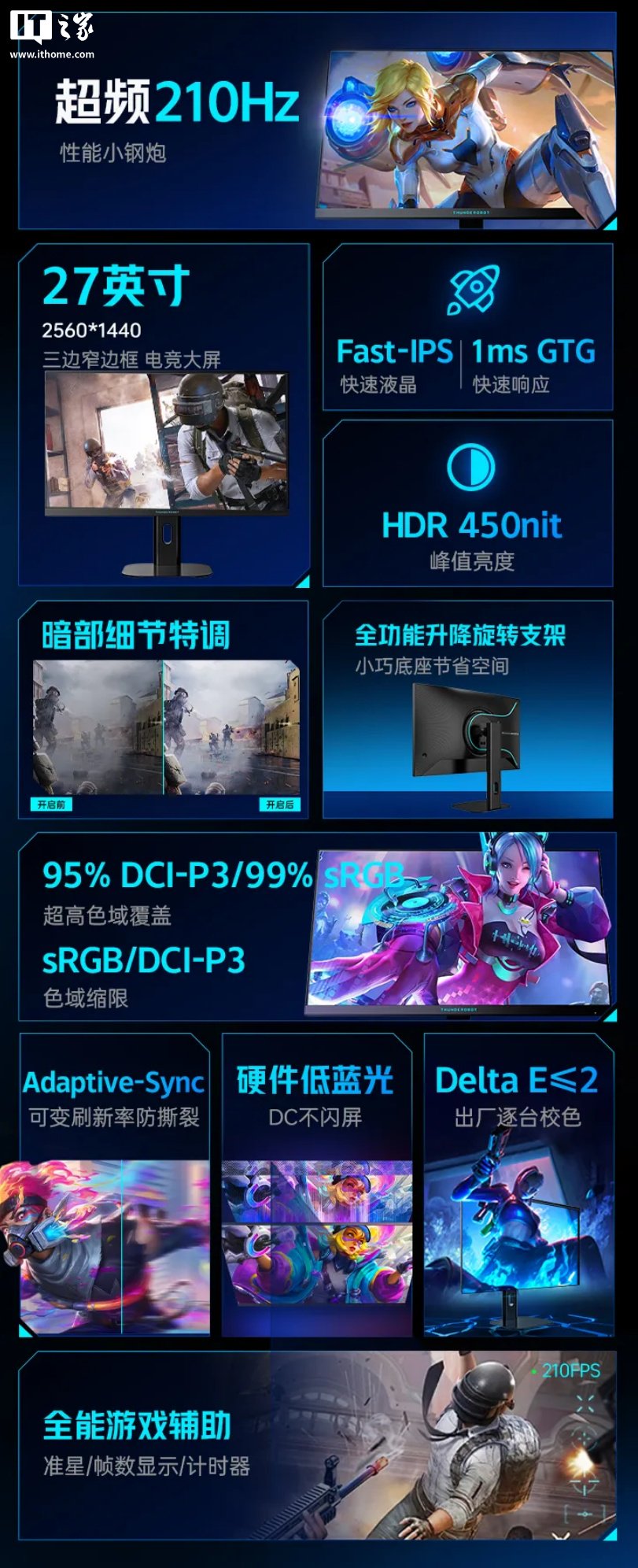 该显示器采用三窄边框设计、Fast-IPS 屏,支持超频 210Hz、HDR 450 尼特亮度、1ms GTG 响应、硬件低蓝光,覆盖 95% DCI-P3 色域、99% sRGB 色域。