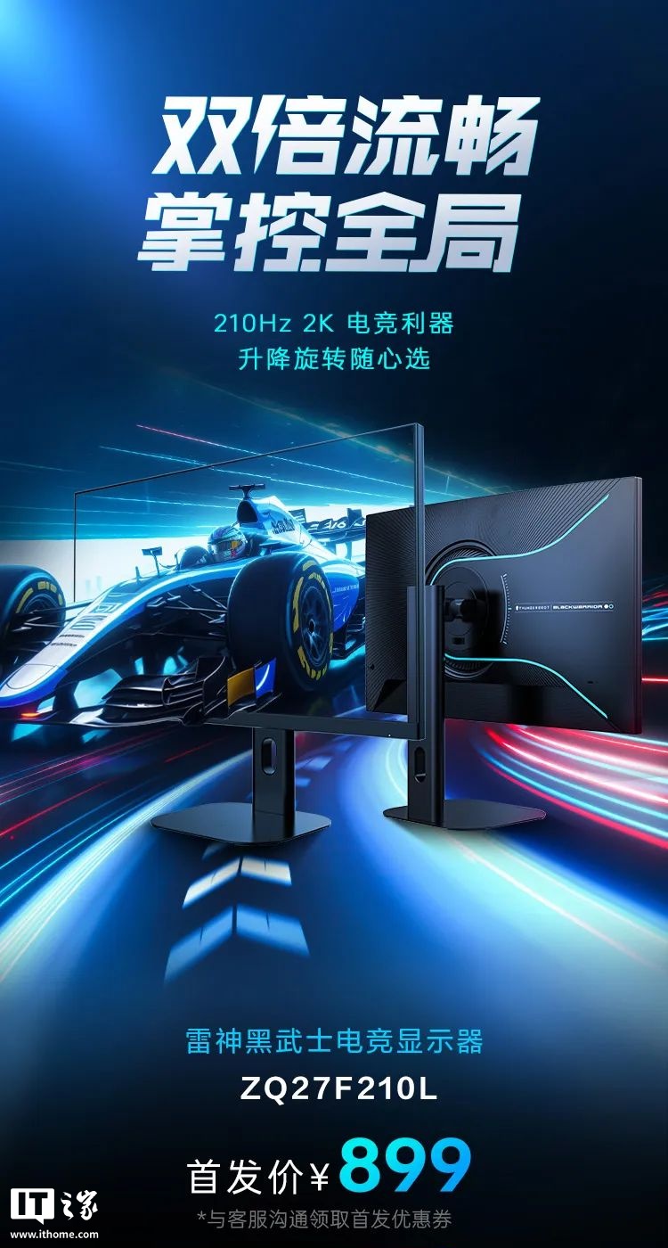 IT之家 2 月 24 日消息,雷神科技今日发布一款黑武士电竞显示器 ZQ27F210L,配有 27 英寸 2K 210Hz 屏,首发价 899 元。