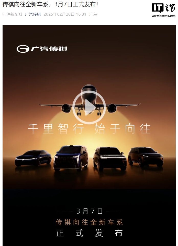 IT之家 2 月 24 日消息,广汽传祺将于 3 月 7 日发布全新车系 —— 向往,官方预告图显示共包含四款车型,分别为两款 SUV、一款 MPV、一款轿车。