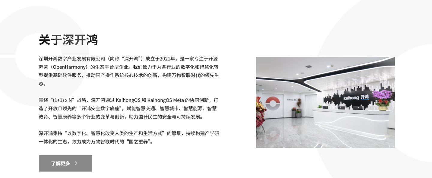 IT之家注:深圳开鸿数字产业发展有限公司(简称“深开鸿”)成立于 2021 年,是一家专注于开源鸿蒙(OpenHarmony)的生态平台型企业,目前该公司产品服务包括:KaihongOS、超级设备管理平台等。