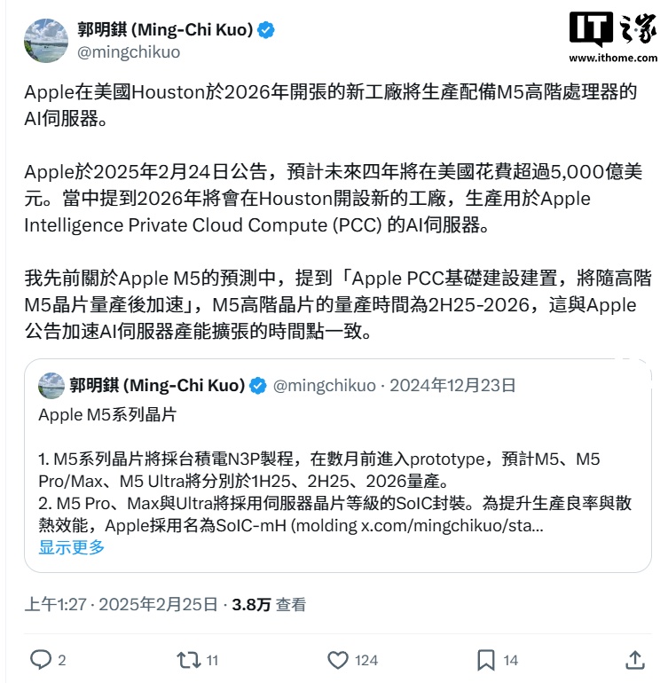 IT之家 2 月 25 日消息,天风国际证券分析师郭明錤今日在社交平台 X 发文称,苹果公司在美国休斯顿于 2026 年开张的新工厂将生产配备 M5 高阶处理器的 AI 服务器。
