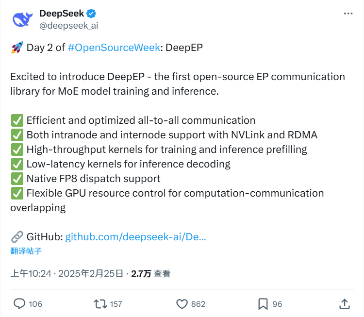 IT之家 2 月 25 日消息,DeepSeek 的“开源周”活动今日已经来到第二天,今天发布的是首个开源的用于 MoE 模型训练和推理的 EP 通信库 ——DeepEP。