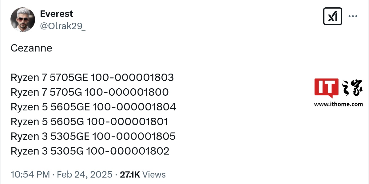 IT之家 2 月 25 日消息,X 平台消息人士 Everest (@Olrak29_) 表示,AMD 将推出 6 款锐龙 5005G 系列桌面 APU,为 AM4 用户带来“新的”选择。