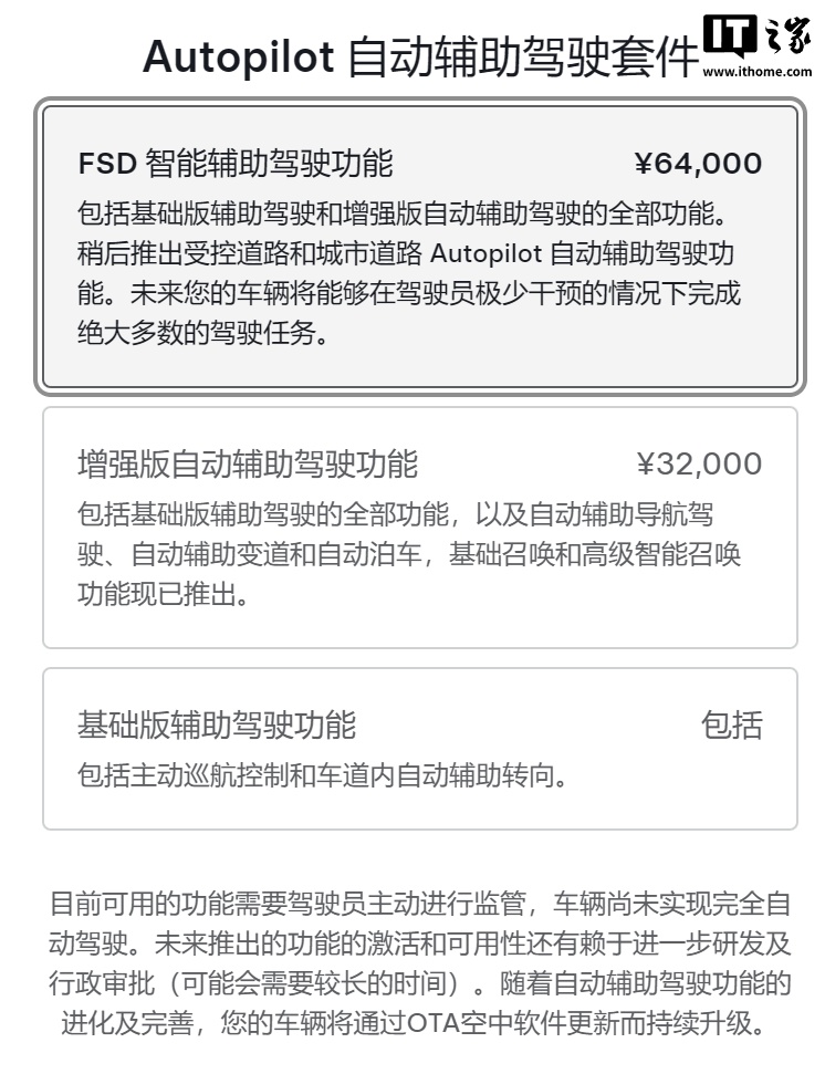 IT之家 2 月 25 日消息,特斯拉官网显示,FSD 驾驶套件被更名为“FSD 智能辅助驾驶功能”,并重新描述其具有的能力,售价仍是 6.4 万元。此前 FSD 功能被直译为“完全自动驾驶能力”。