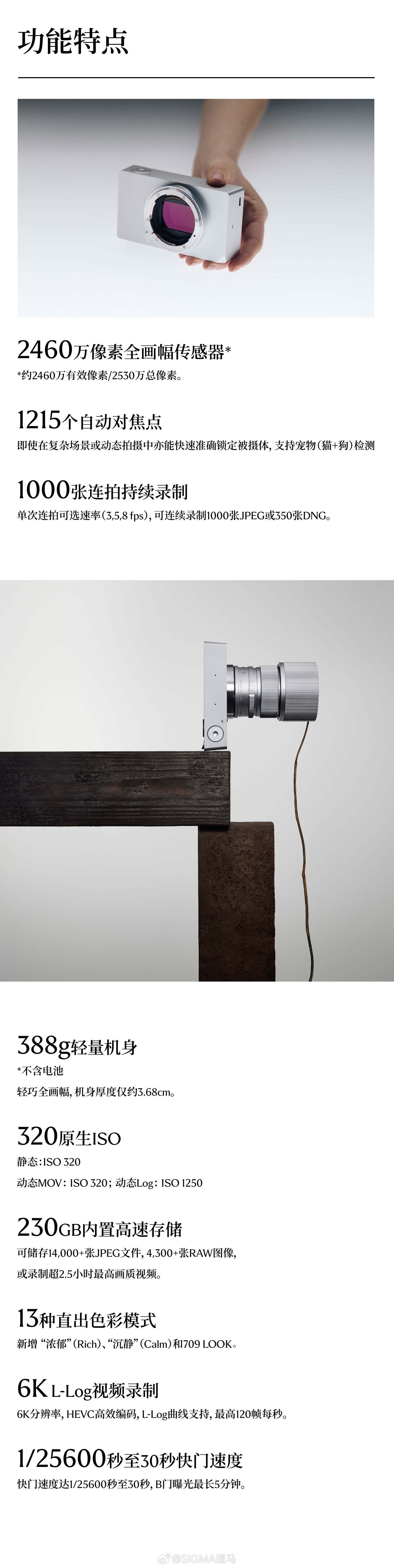 该相机配有 2460 万像素全画幅传感器,支持 1215 个自动对焦点,可连续拍摄 1000 张照片;拥有 320 原生 ISO,内置 230GB 存储,支持 6K L-Log 视频录制,适配 L 卡口。