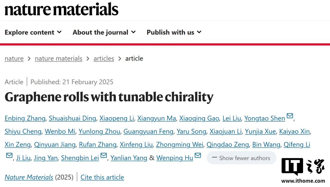 该成果于 2025 年 2 月 22 日发表于《自然・材料》(IT之家附 DOI:10.1038 / s41563-025-02127-8),首次在室温下实现手性石墨烯卷 90% 以上的自旋极化率,为量子计算与自旋电子器件发展提供了关键技术支撑