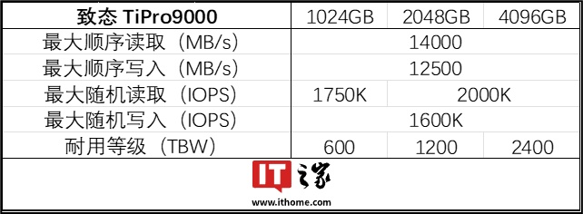 TiPro9000 4TB 依旧采用长江存储 Xtacking 4.0 架构 3D TLC NAND 闪存颗粒,搭载独立外置 DRAM 缓存。该版本的标称读写性能与 2TB 款一致,具体可参见IT之家所整理下表: