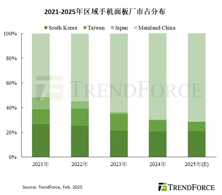 陆系面板厂有中高阶 AMOLED 和低阶 a-Si LCD 需求带动,快速扩大市占率,2024 年达 69.8%,2025 年可能超过 70%,持续在全球智能型手机供应链中扮演关键角色。