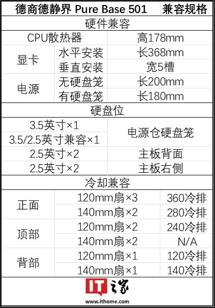 Pure Base 501 系列机箱宽深高 231×450×449 mm,体积 46.67L,支持 ATX 及以下主板,拥有 7 条 PCIe 扩展槽,支持显卡竖装,其具体兼容规格如下: