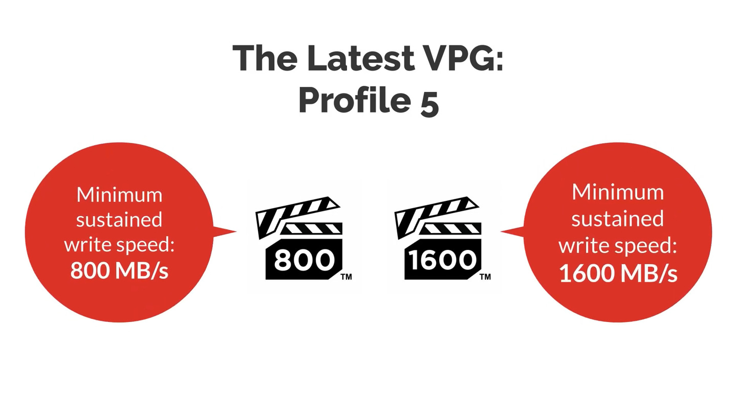 新版本的 VPG-5 规范在已有的 VPG400 等级上新增了 VPG800 和 VPG1600 两档,符合这两档要求的 CFe 卡持续写入性能需分别达到 800MB/s 和 1600MB/s,以保障高速录制时不会出现丢帧问题。