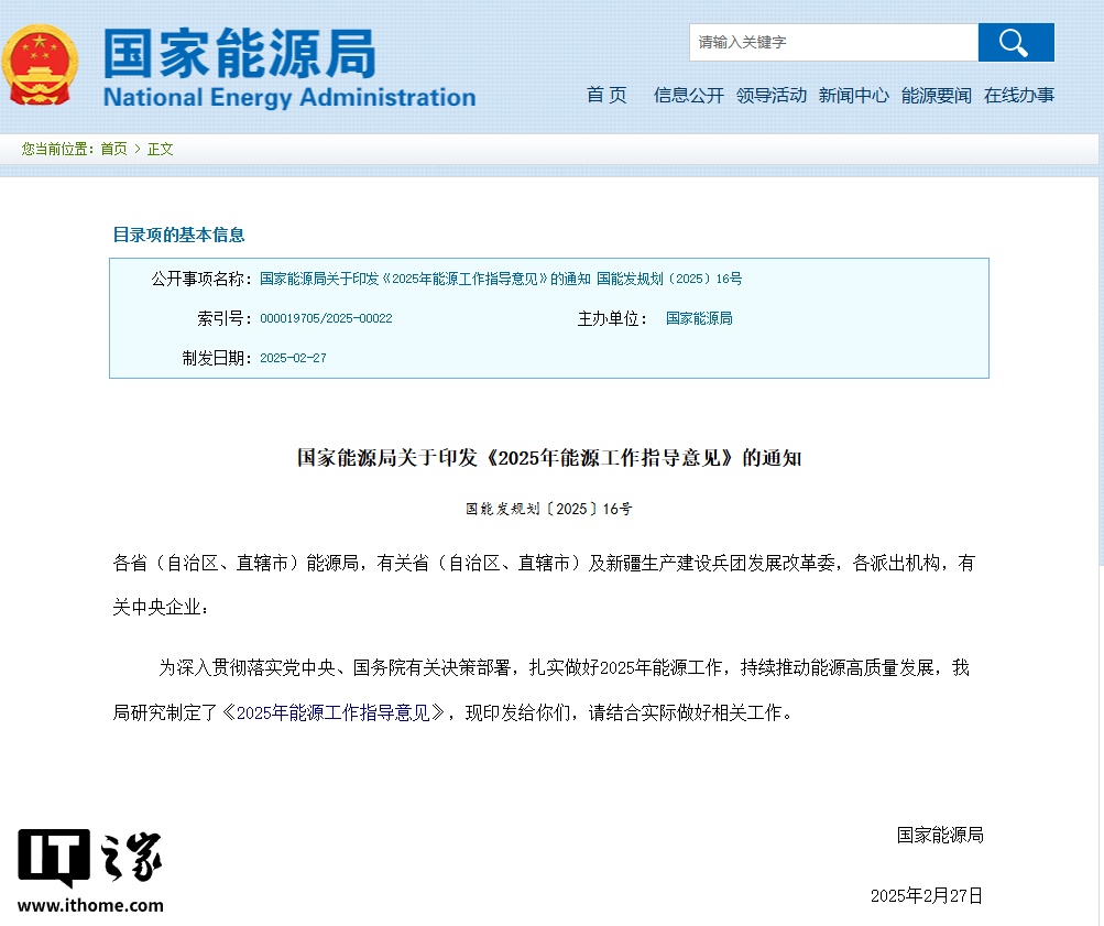 IT之家 2 月 27 日消息,国家能源局今日印发《2025 年能源工作指导意见》,提出了 2025 年能源工作的主要目标,IT之家总结重点如下: