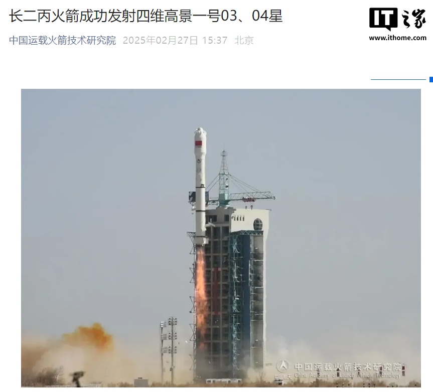 IT之家 2 月 27 日消息,2 月 27 日 15 时 08 分,由火箭院抓总研制的长征二号丙火箭(简称长二丙火箭)在酒泉卫星发射中心点火升空,一箭双星,成功将四维高景一号 03、04 星精准送入预定轨道,发射任务取得圆满成功。