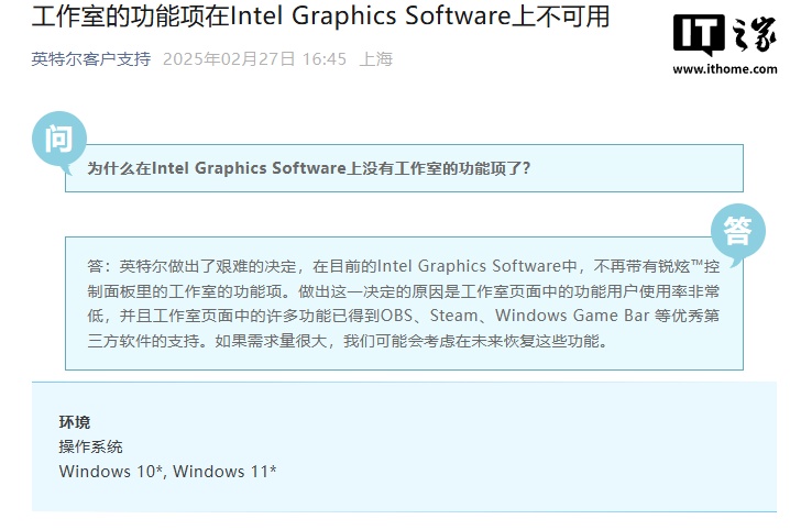 IT之家 2 月 27 日消息,针对“Intel Graphics Software 中不再提供 Studio 页面或 Intel Arc Control 之类的功能”,英特尔客户支持今日发布公告,IT之家附原文如下: