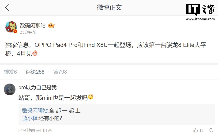 爆料还提到,mini 新品也将一同在 4 月推出,预计是指 OPPO Find X8 mini。