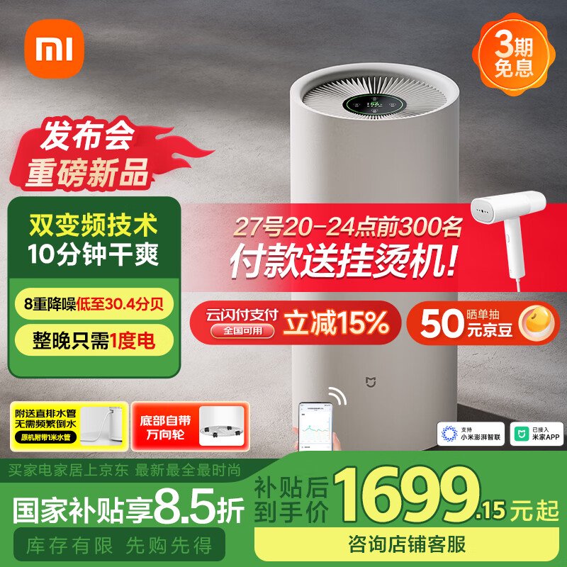 IT之家 2 月 27 日消息,除了手机、配件等电子产品外,小米还带来了米家首款变频除湿机 —— 米家智能变频除湿机 30L,售价 1999 元,国补到手价至低 1699.15 元,现已开售。