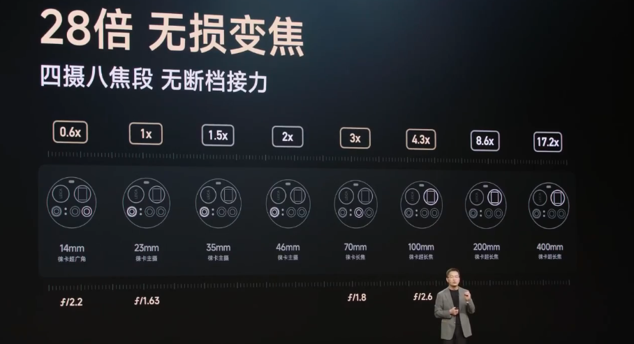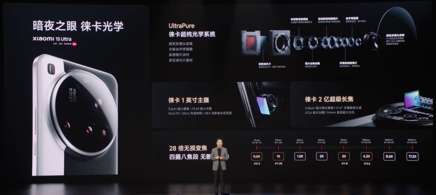 影像方面,小米 15 Ultra 拥有徕卡光学专业四摄,14mm-400mm 全焦段覆盖,最远 28 倍无损变焦,号称口袋里的“大三元”,影像代号“夜神”: