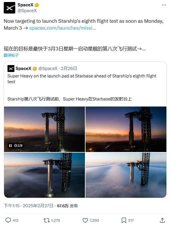 IT之家 2 月 27 日消息,SpaceX 宣布将星舰(Starship)第八次试飞(Flight 8)任务推迟至北京时间 3 月 4 日 7:30,原定于 2 月 28 日的发射计划取消。