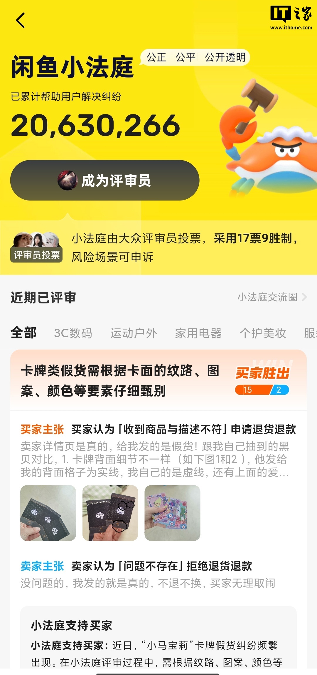 此次升级重点在于建立垂直领域评审员团体。平台根据用户历史评审行为数据,筛选出超 40 万名活跃用户,按“乐器”“时尚饰品”“二次元”“3C 数码”“游戏”“翡翠黄金珠宝”等 10 个垂直领域分类,结合 AI 能力构建专业评审模型。当纠纷发生时,系统自动匹配不少于 5 名相关领域专业评审员与普通用户组成“陪审团”,确保评审结果的专业性和准确性。