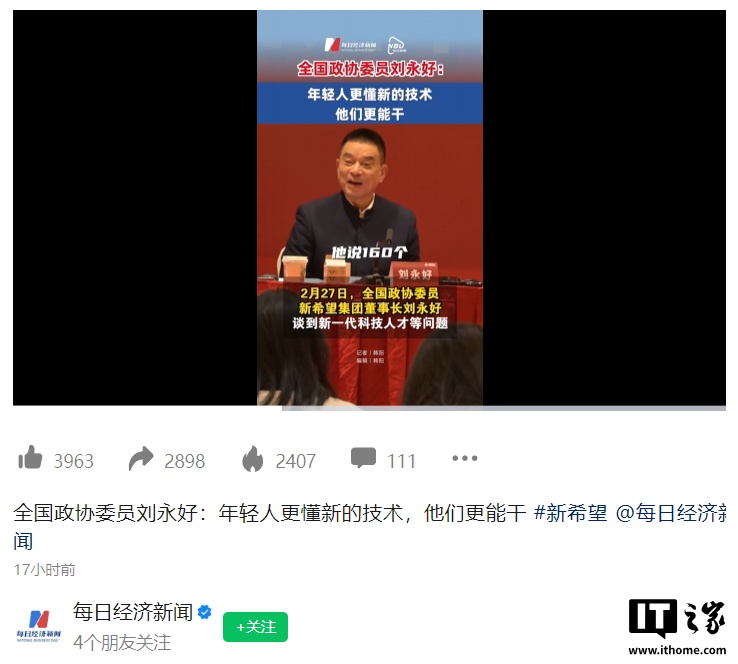 IT之家 2 月 28 日消息,2025 全国两会召开在即。2 月 27 日,全国政协委员、新希望集团董事长刘永好两会媒体沟通会在北京召开。
