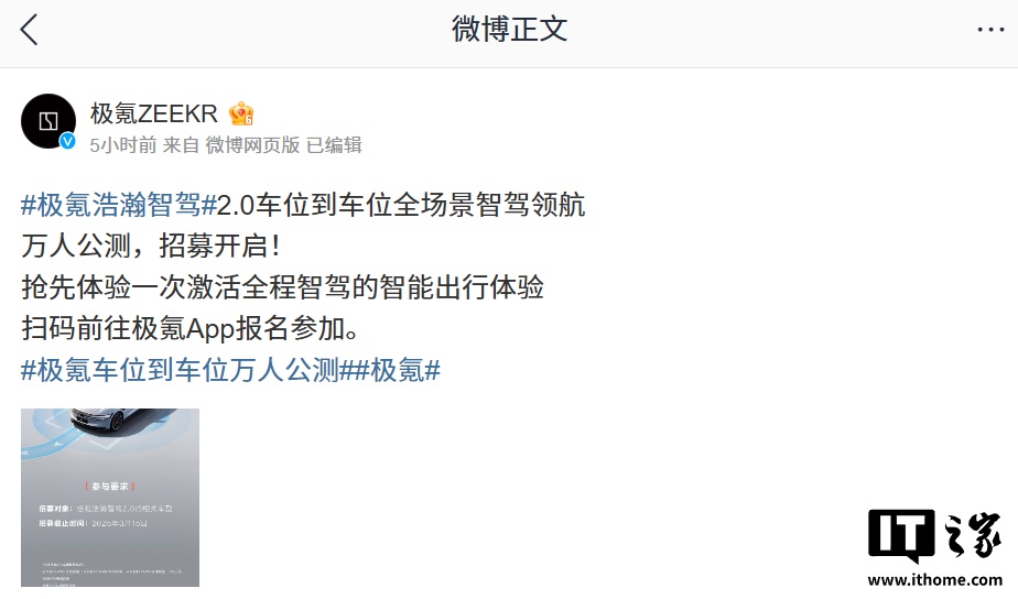 IT之家 2 月 28 日消息,极氪官方今日宣布,极氪浩瀚智驾 2.0 车位到车位全场景智驾领航开启万人公测招募。