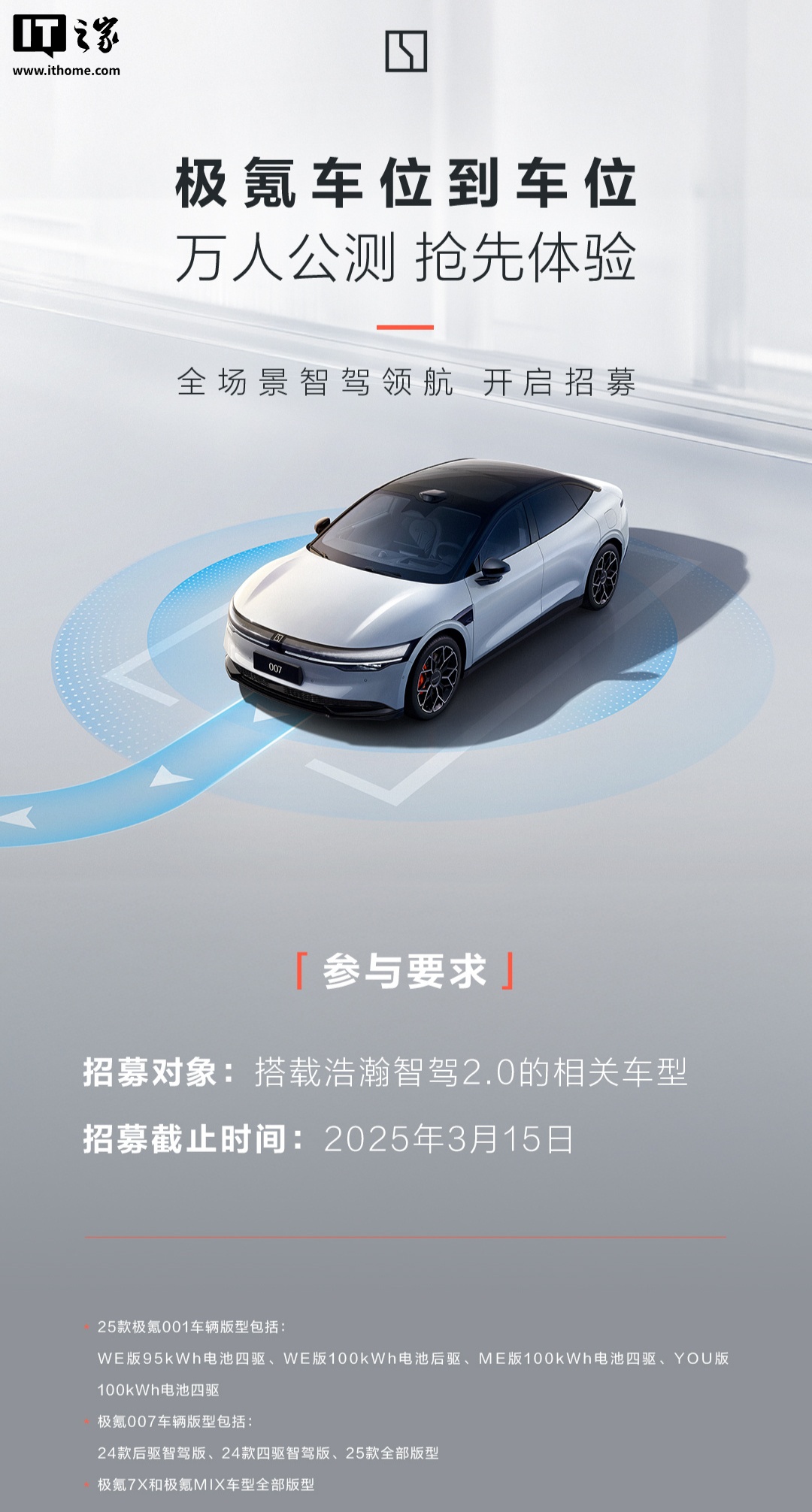IT之家附极氪浩瀚智驾 2.0 车位到车位全场景智驾领航此次招募注意事项如下: