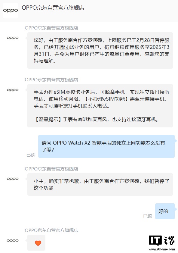 IT之家注意到,OPPO Watch X2 智能手表“独立上网”功能已下线,各电商平台详情页也不再宣传该功能。另据用户反馈,OPPO 健康 App 也已关闭 Watch X2 智能手表上网功能的相关业务开通入口。