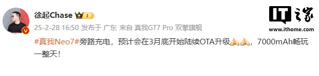 IT之家 2 月 28 日消息,realme 真我副总裁、全球营销总裁、中国区总裁徐起今日发文称,真我 Neo7 手机“旁路充电”预计 3 月底陆续 OTA 升级。