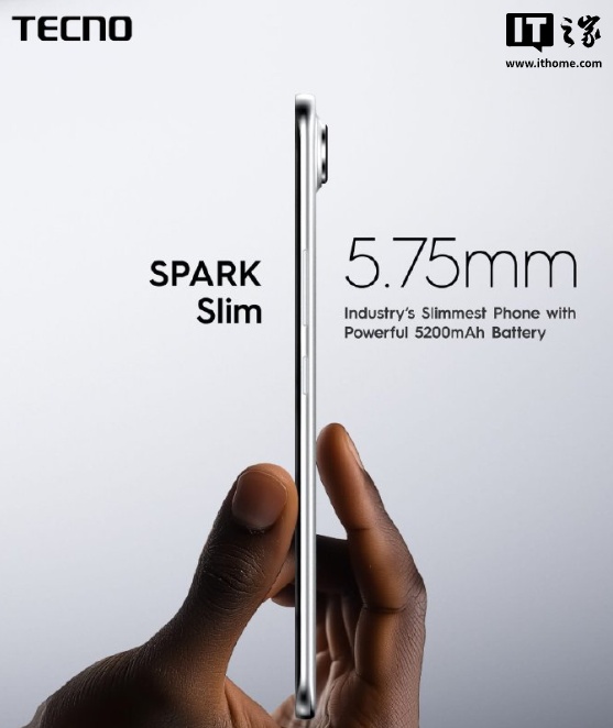 IT之家 2 月 28 日消息,传音今日公布一款 TECNO SPARK Slim 手机,号称全球最薄的智能手机,厚度最薄为 5.75mm。