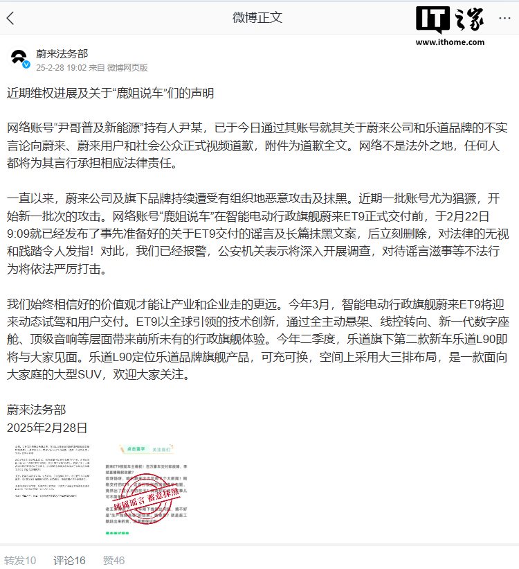 IT之家 2 月 28 日消息,蔚来法务部公布了针对网络恶意造谣和抹黑行为的维权进展,表示将联合警方依法严厉打击“鹿姐说车”等恶意造谣账号的不法行为。