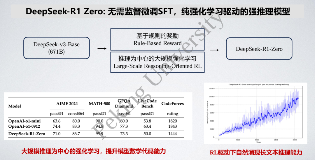DeepSeek-R1 Zero 完全放弃了 SFT 监督微调,纯靠 RL 强化学习的方法进行训练。