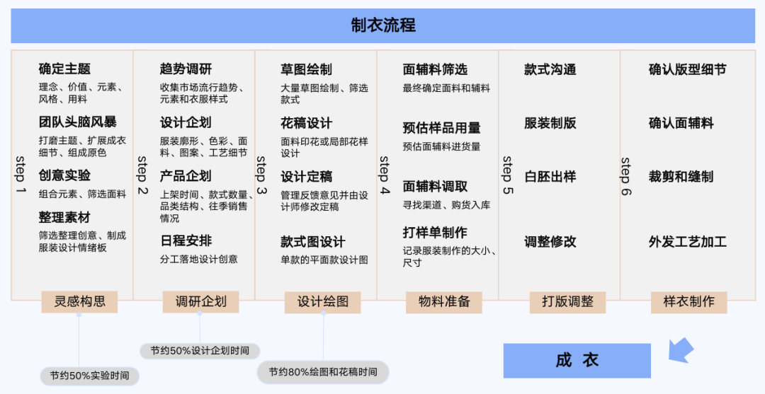 比如传统的制衣流程中,AI 可以在前期的灵感构思、调研企划及设计绘图环节节约大量的时间。