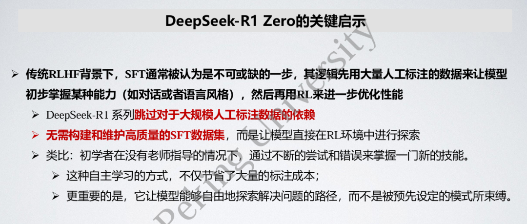 跳过了 SFT 的阶段采用纯强化学习的方法,也就让大模型摆脱了对于大规模人工标注数据的依赖,训练成本大大降低。