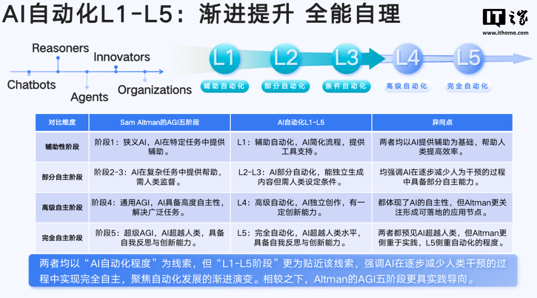 和自动驾驶类似,AI 自动化的道路上也有着 L1 到 L5 的说法,AI 将逐渐从单一领域的简单任务执行,发展为完全的自动化。