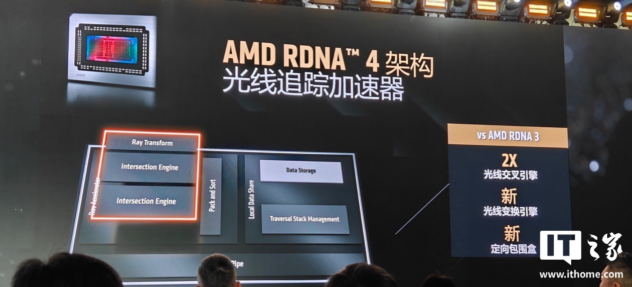 在光线追踪上,AMD RDNA 4 架构更新了第三代光线追踪加速器,每个计算单元的光线追踪吞吐量提升超过 2 倍,还包括新的光线变换引擎和定向包围盒;