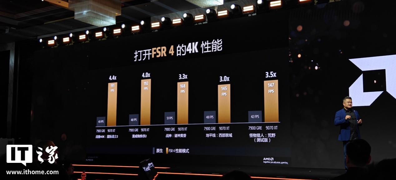 除此之外,两款显卡所搭载的全新一代 FidelityFX Super Resolution 4(FSR 4)技术,它基于 RDNA 4 架构开发,通过 AI 超分辨率 + 帧生成的方式,实现了游戏画质、4K 输出以及游戏帧数的飞跃,大幅提升游戏的性能表现。官方以 AMD Radeon RX 9070 XT 显卡为例,展示了 5 款游戏在原生画质和 FSR 4 性能选项下的表现对比,游戏平均帧数至少提升 3 倍,至多提升 4.4 倍。