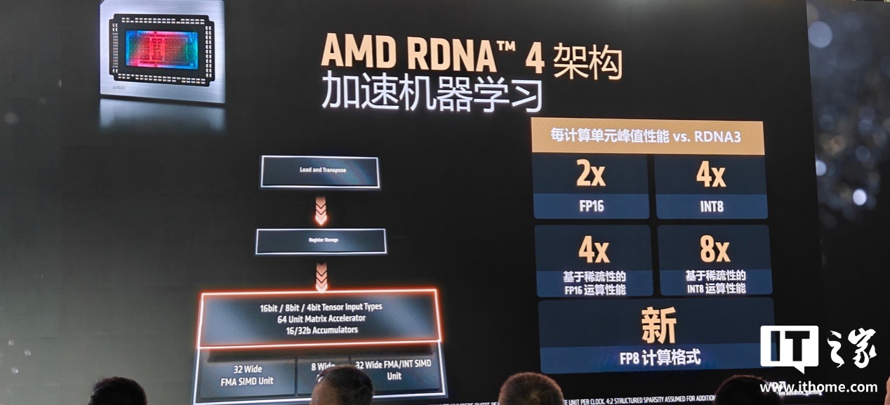 而在机器学习方面,AMD RDNA 4 架构在每计算单元峰值性能表现上,相比 AMD RDNA 3 架构实现了 4 倍的 FP16 浮点运算吞吐量提升,8 倍 INT8 运算吞吐量提升,还新增了 FP8 计算格式。